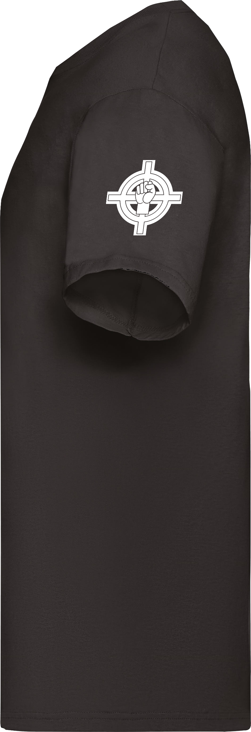 Camiseta negra con nombre la banda en el pecho con las letras góticas originales del disco «Hordas celtíberas».